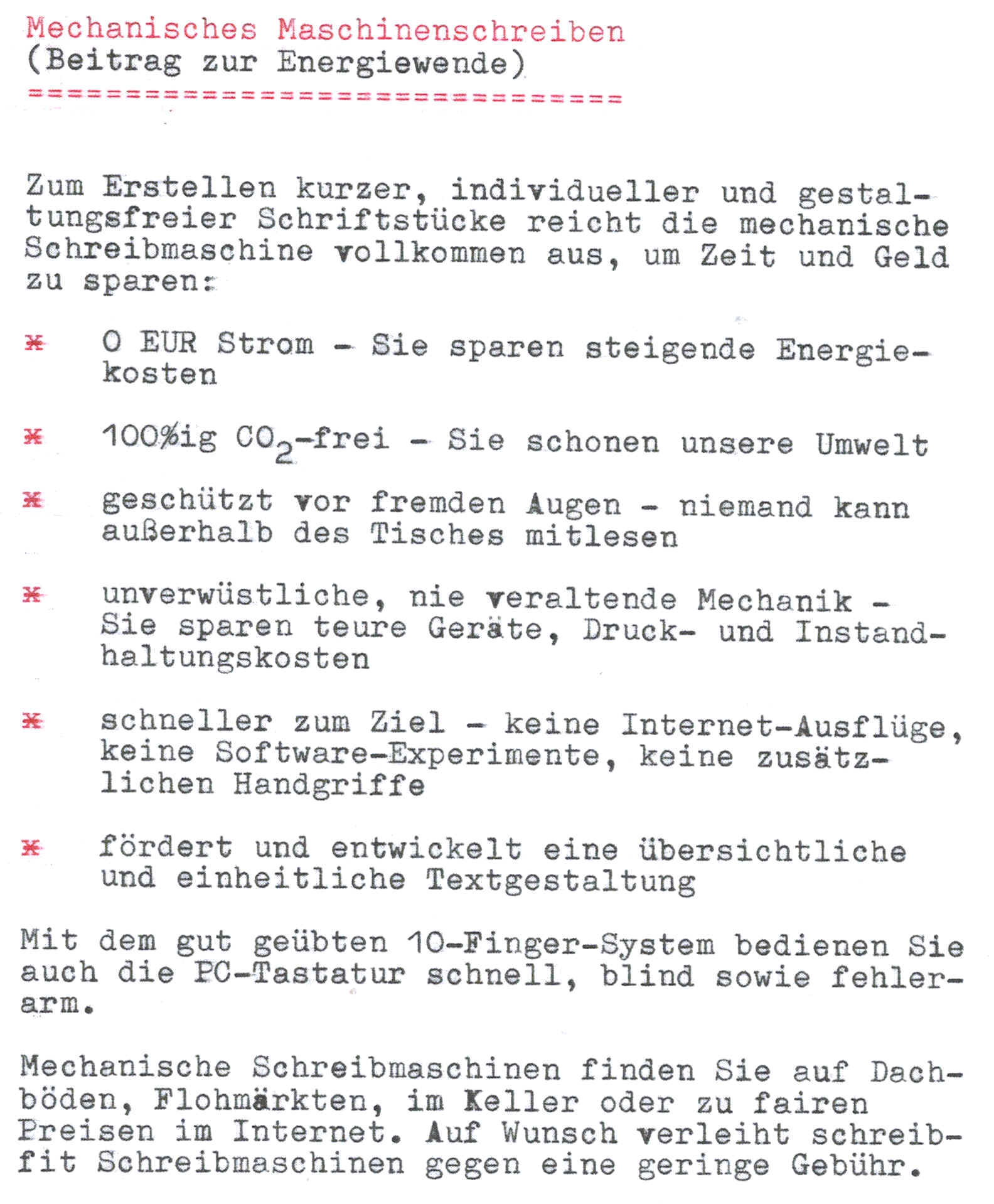 Die Stenografie ist Ihre schnelle Handschrift mit Zukunft: kostenlos, CO2-frei und diskret. Das gilt auch für die mechanische Schreibmaschine, deren Farbband nicht ausgelesen werden kann. Kopfrechnen hinzuaddiert, sind das bei Stromausfall oder Cyber-Attacken drei starke Helfer in der Not. Die drei sind frei von Seltenen Erden, KI-Lizenzen und Tech-Konzernen!