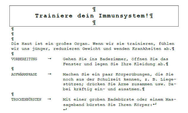 Praktisch und prophylaktisch - 2020-03-15 Spezial-Techniken der Textverarbeitung: Zweitzeilen-Einzug, Soft-Return und Spalten-Markieren. Arbeitsblatt zur Absatzformatierung.