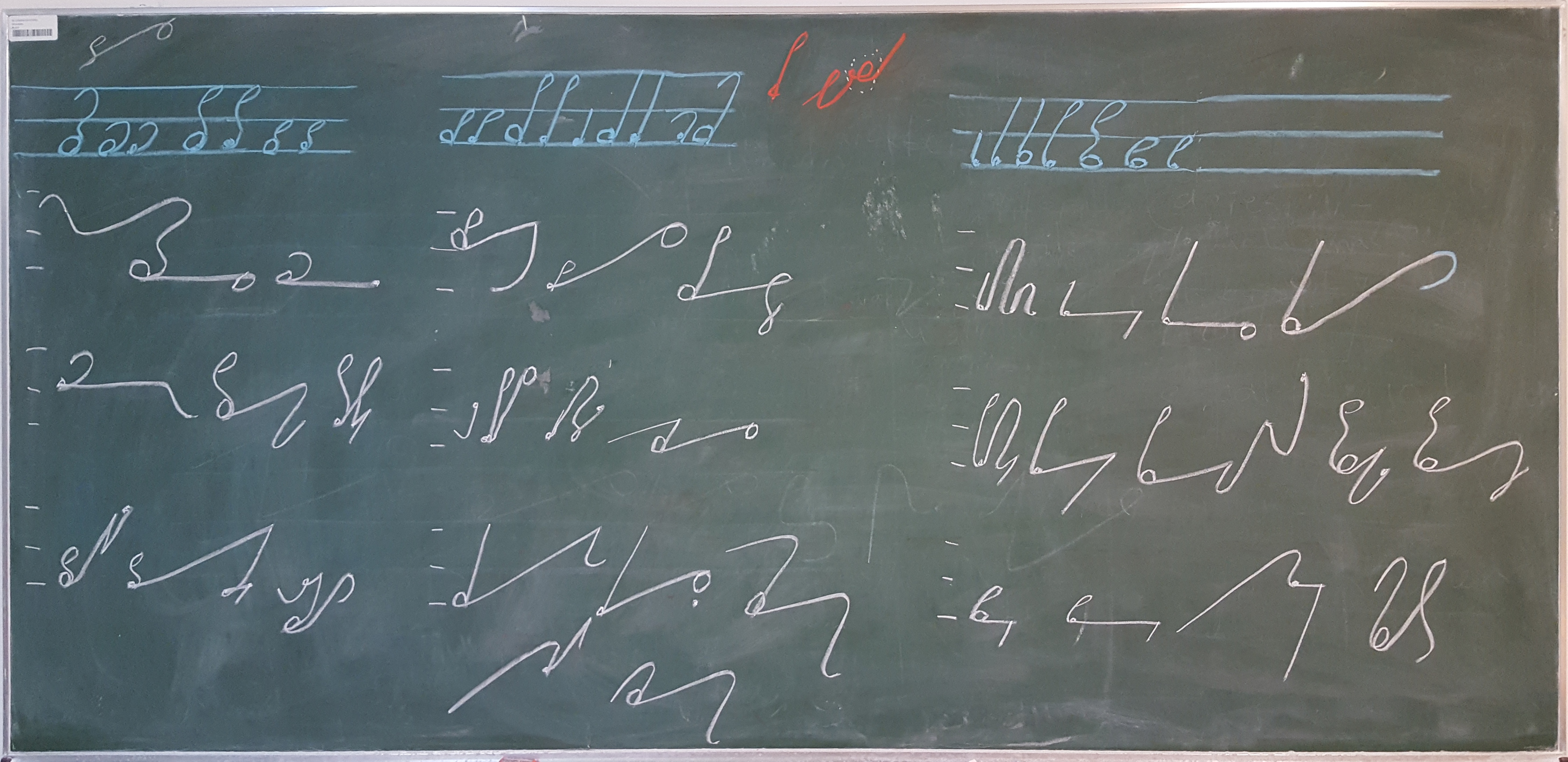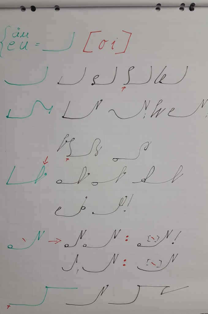 Aktueller Stenokurs - Tafelbild vom 28. Februar 2018 l und r nach linken, spitzen und rechten Konsonanten-Füßen.